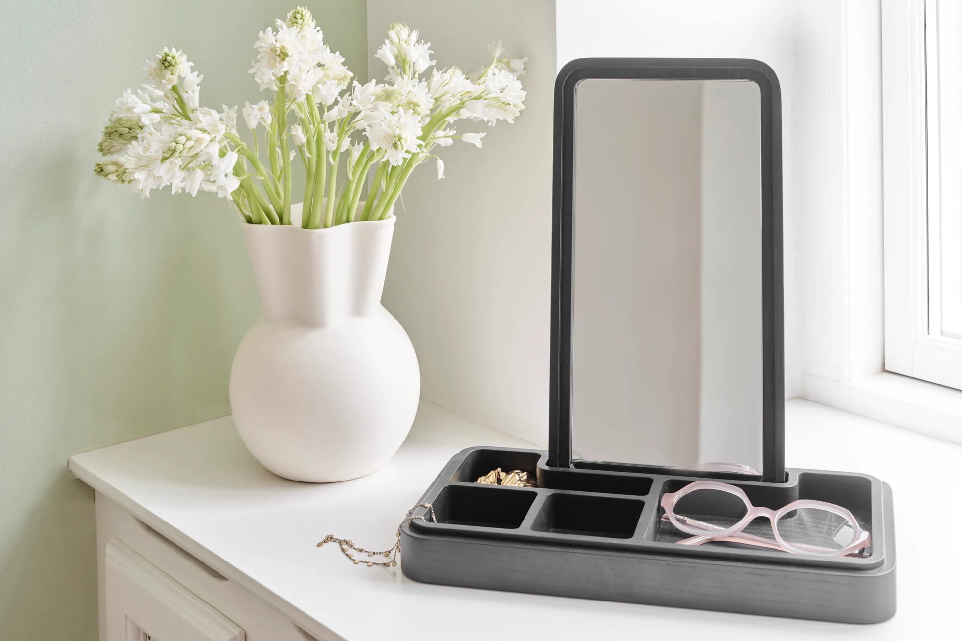 Mirror Box is a smart design that scores high on both aesthetics and functionality. The lid conceals a mirror, which you can place upright in the box. The box itself is split into smaller compartments, which are ideal for items such as jewellery, hair bands, keys and cards. This makes the Mirror Box the perfect jewellery box or storage box for the hallway table for loose change and similar small items. A beautiful design in a lovely black colour.
